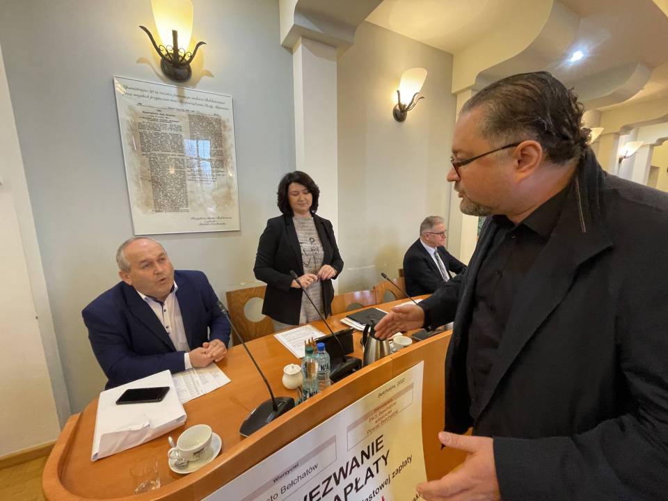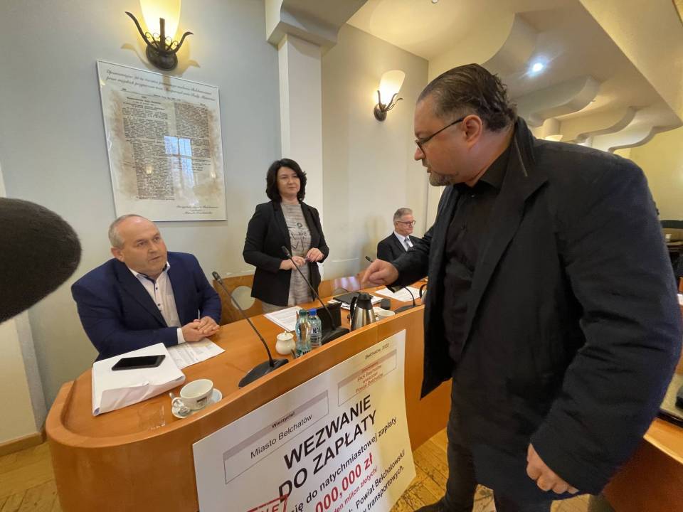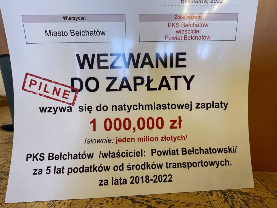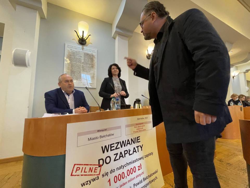 Nerwowy początek obrad powiatowych radnych, zanim ci przystąpili do pracy, na sali pojawił sie miejski radny z nietypowym gadżetem. Marcin Rzepecki chciał wręczyć staroście Dorocie Pędziwiatr „wezwanie do zapłaty". Symboliczny czek opiewający na kwotę 1 miliona złotych. Z czego ona wynika i dlaczego radny domaga się uiszczenia opłaty na rzecz miasta Bełchatowa?