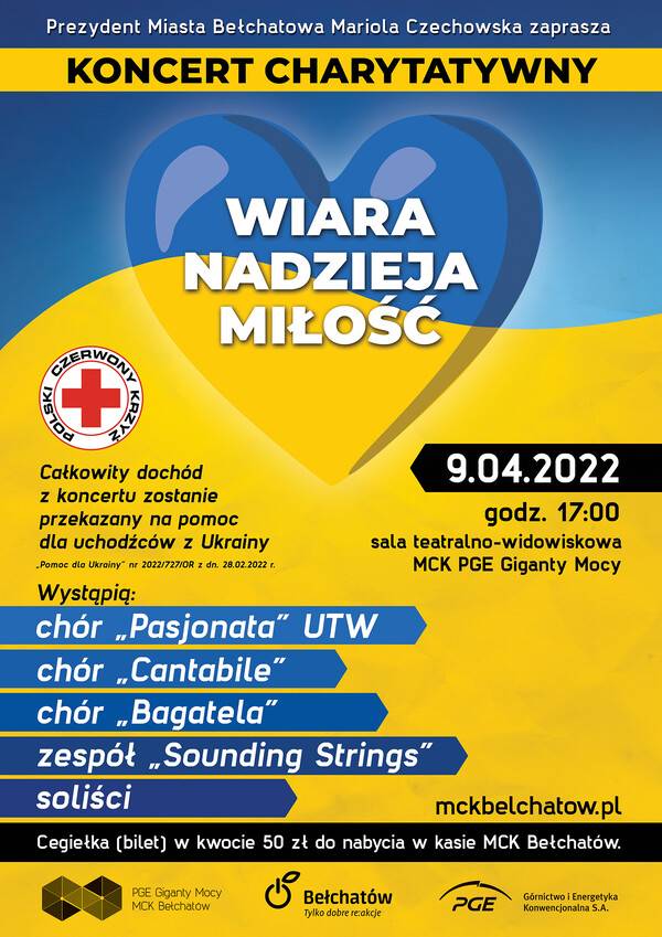 Prezydent Miasta Bełchatowa Mariola Czechowska zaprasza na wyjątkowy koncert charytatywny pt. „Wiara, nadzieja, miłość", który odbędzie się 9 kwietnia br. o godzinie 17:00 w sali teatralno-widowiskowej MCK PGE Giganty Mocy.