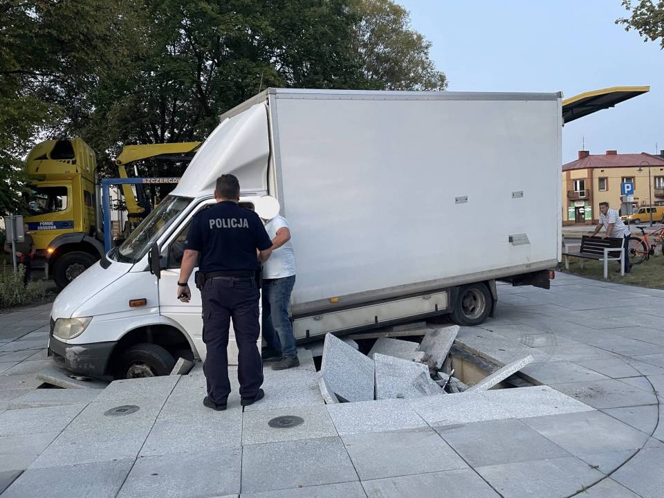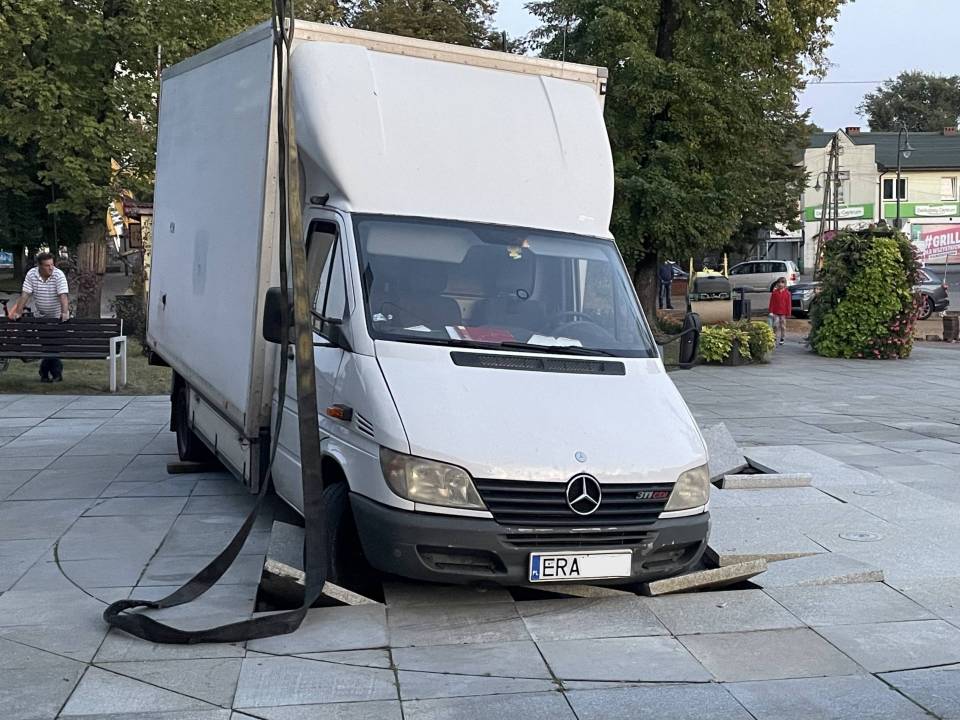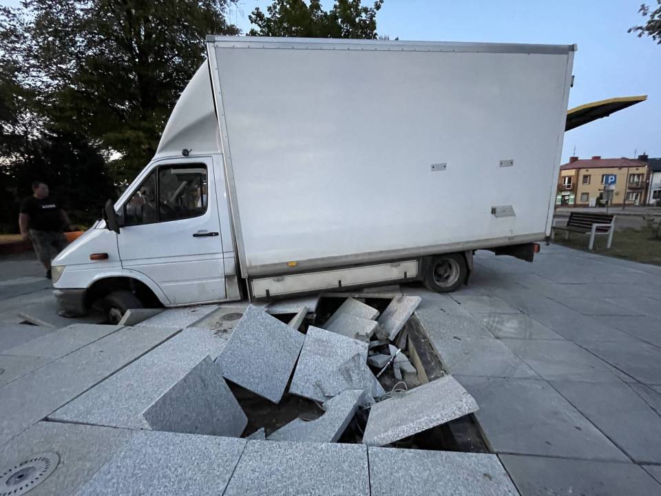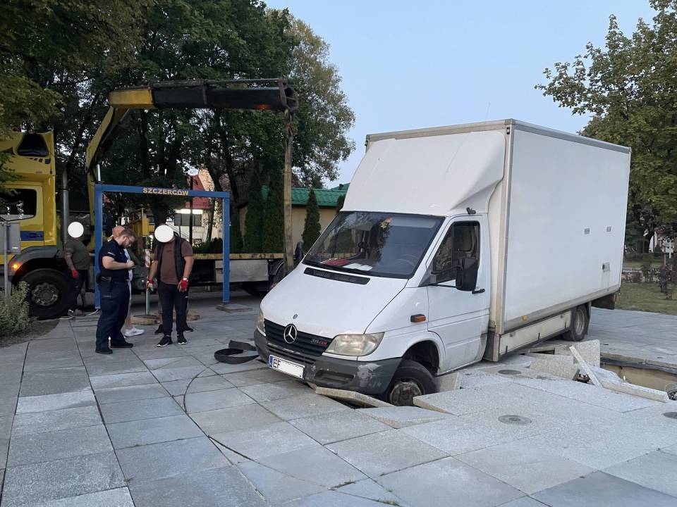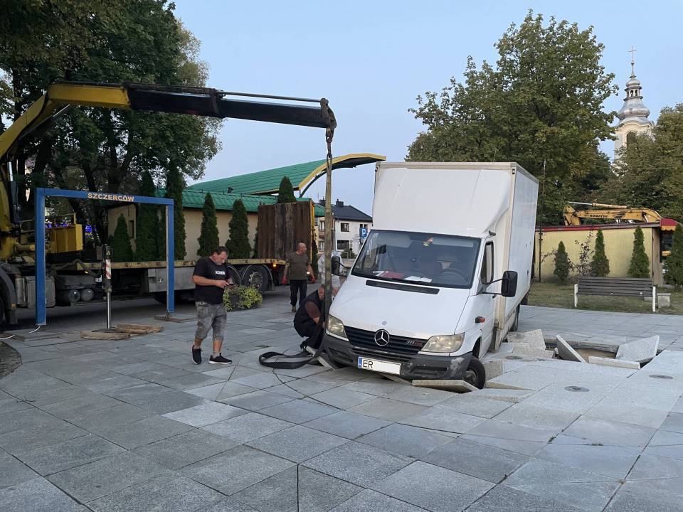 Do zdarzenia doszło wczesnym wieczorem. Sporych rozmiarów dostawczak totalnie utknął w wyrwie jaka powstała po zapadnięciu się granitowych płyt. Niezbędnym okazała się pomoc cięższego holownika, który przez kilkanaście minut wyciągał pojazd z zapadnietej fontanny. Okazało się, że sprawcą zdarzenia był kierowca z powiatu radomszczańskiego.