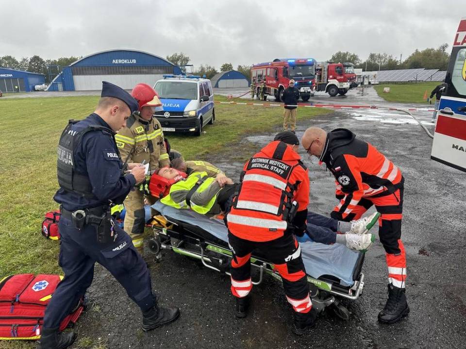 - Kierujący lotami pełniący dyżur na wieży otrzymał zgłoszenie od załogi samolotu, która była nad lotniskiem, że przestał im pracować silnik. Załoga podjęła próbę lądowania bez silnika i niestety próba ta okazała się dość dramatyczna w skutkach. Samolot uderzył w ziemię i zaczął się z niego wydobywać dym. Niezwłocznie poinformowane zostały służby ratunkowe pod numerem 112, a na miejsce udał się zespół zarządzający lotniskiem, by ratować poszkodowanych. Taki był scenariusz ćwiczeń kompleksowych -powiedział Marcin Pampuch, dyrektor Aeroklubu i zarządzający lotniskiem.
