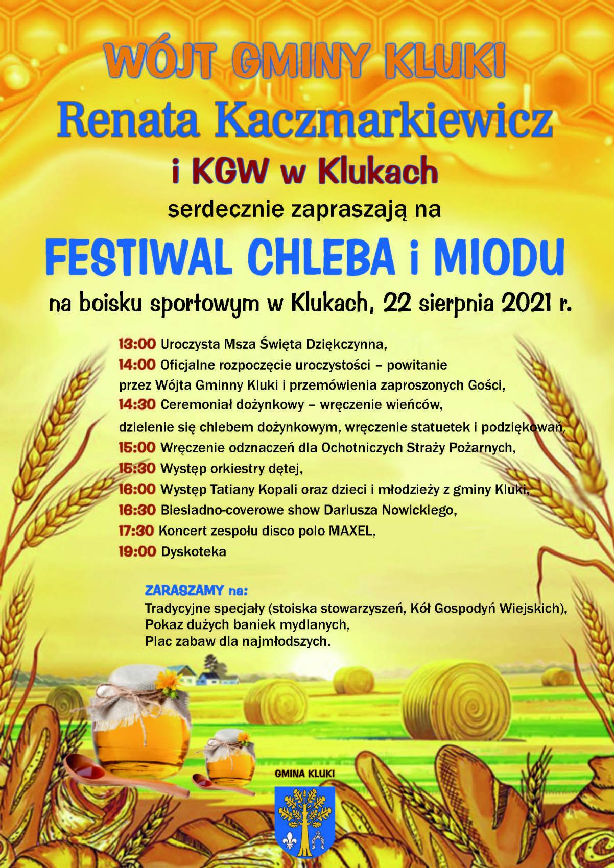 Na najbliższą niedzielę, 22 sierpnia zaplanowano w gminie Kluki Festiwal Chleba i Miodu. Na kluckim boisku sportowym zaplanowano tradycyjne dożynkowe ceremoniały, jak i atrakcje z koncertami i dyskoteką włącznie. Spotkanie zainauguruje o 13.00 dziękczynna msza święta.