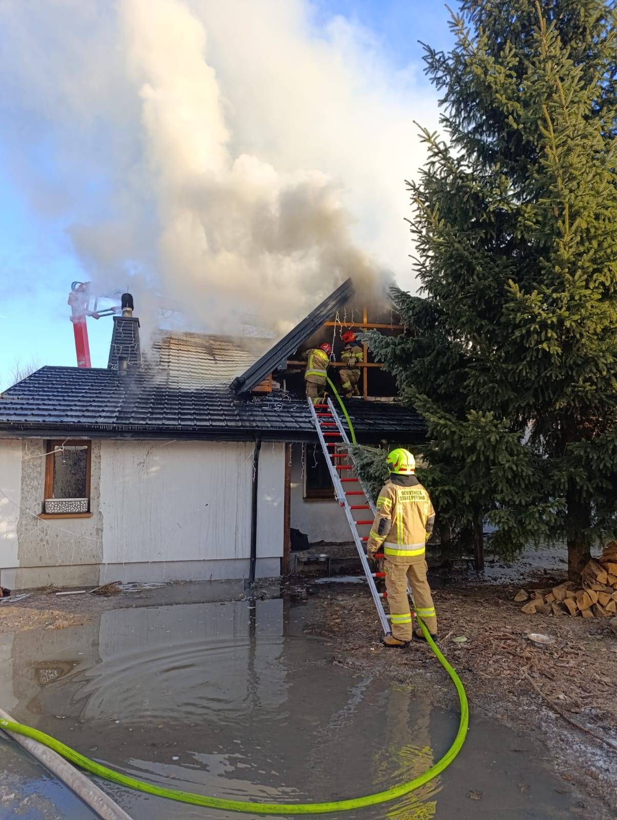 Po dotarciu na miejsce zdarzenia strażacy zastali palący się dach budynku, którego znaczna część była już objęta ogniem. W chwili wybuchu pożaru właściciel domu przebywał poza obiektem.