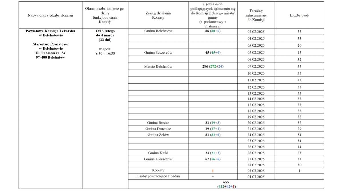 Wezwania do stawienia się przed Komisją otrzymało łącznie 655 młodych mieszkańców powiatu bełchatowskiego (612 z rocznika podstawowego, 42 ze starszych roczników i 1 kobieta), ale trzeba pamiętać o tym, że brak imiennego wezwania nie zwalnia z obowiązku osobistego zgłoszenia się do kwalifikacji.