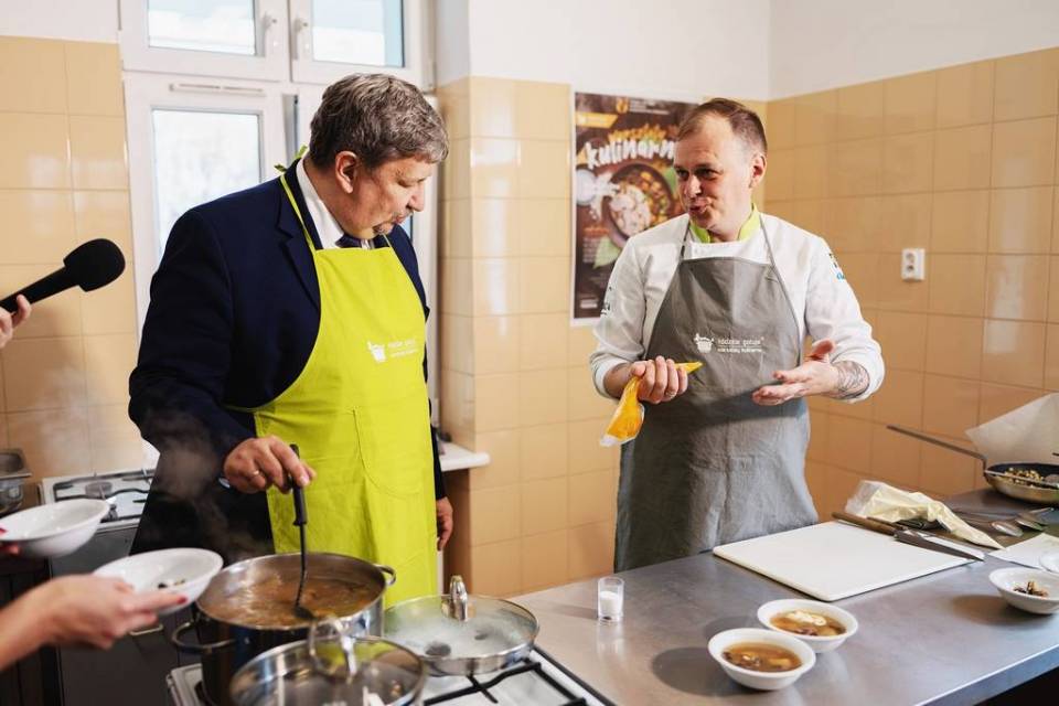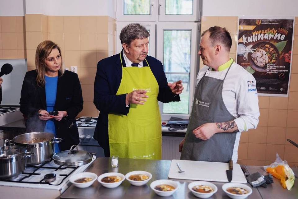 „Łódzkie gotuje" to propozycja dla uczniów szkół gastronomicznych. Organizujemy warsztaty kulinarne z gotowania potraw tradycyjnych w nowoczesnym wydaniu. Cykl rozpoczęliśmy z marszałkiem województwa łódzkiego Grzegorzem Schreiberem w Zespole Szkół Zawodowych nr 2 w Kutnie. Tematem warsztatów były „Cztery pory roku w kuchni", a zajęcia poprowadził renomowany kucharz Tomasz Tracz. Razem z uczestnikami przygotował pełne menu obiadowe na bazie produktów regionalnych z naszego województwa.