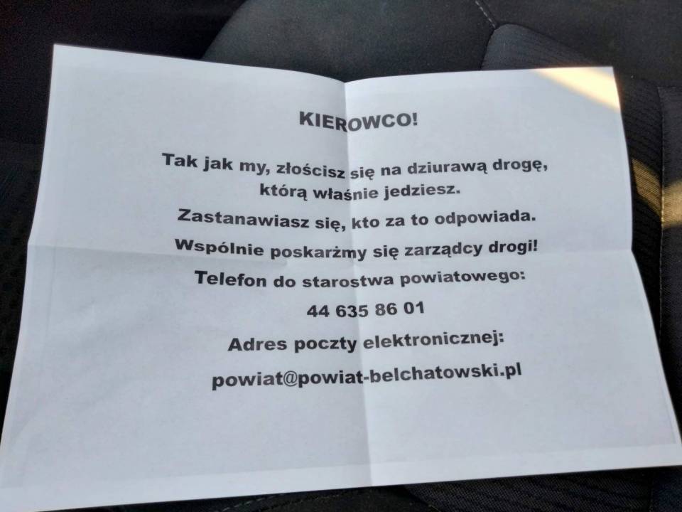 "Kierowco, tak jak my złościsz się na dziurawą drogę, którą właśnie jedziesz. Zastanawiasz się, kto za to odpowiada. Wspólnie poskarżmy się zarządcy drogi! Telefon do starostwa powiatowego: 44 635 86 00" - możemy przeczytać w krótkiej informacji.
