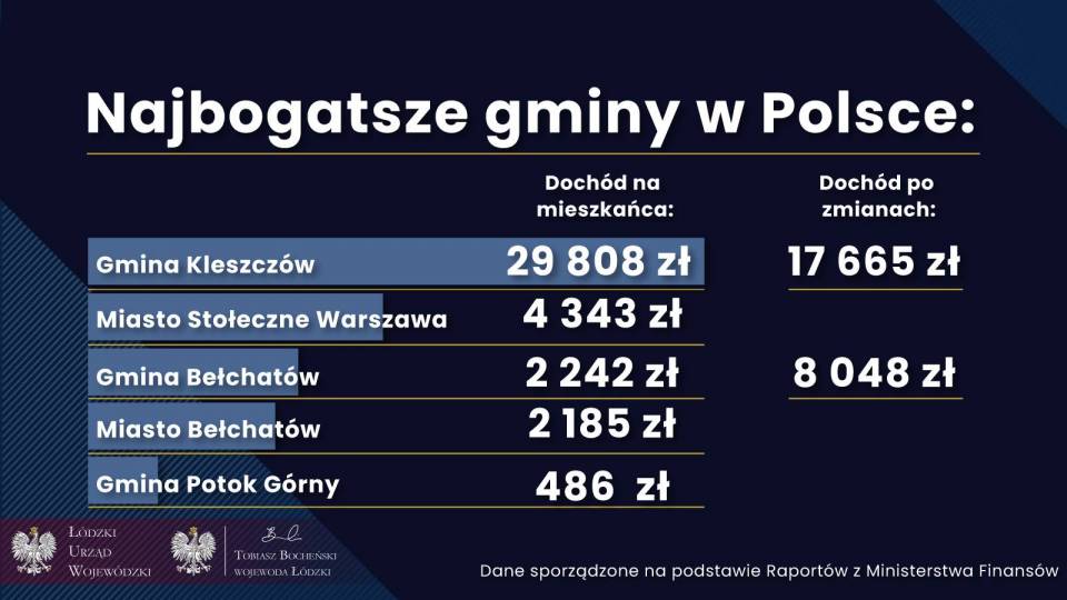 Zgodnie z informacjami prezentowanymi przez Ministerstwo Finansów w zakresie wskaźników podstawowych dochodów podatkowych w przeliczeniu na jednego mieszkańca dla gminy Kleszczów wskaźnik ten wynosi 29 808,10 zł, a dla gminy Bełchatów 2 185,08 zł. Jak ukształtują się te proporcje po zmianie granic?