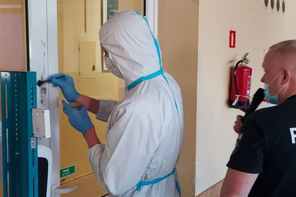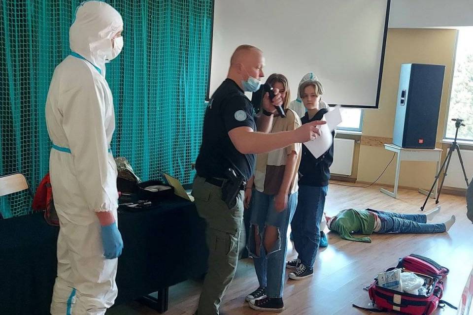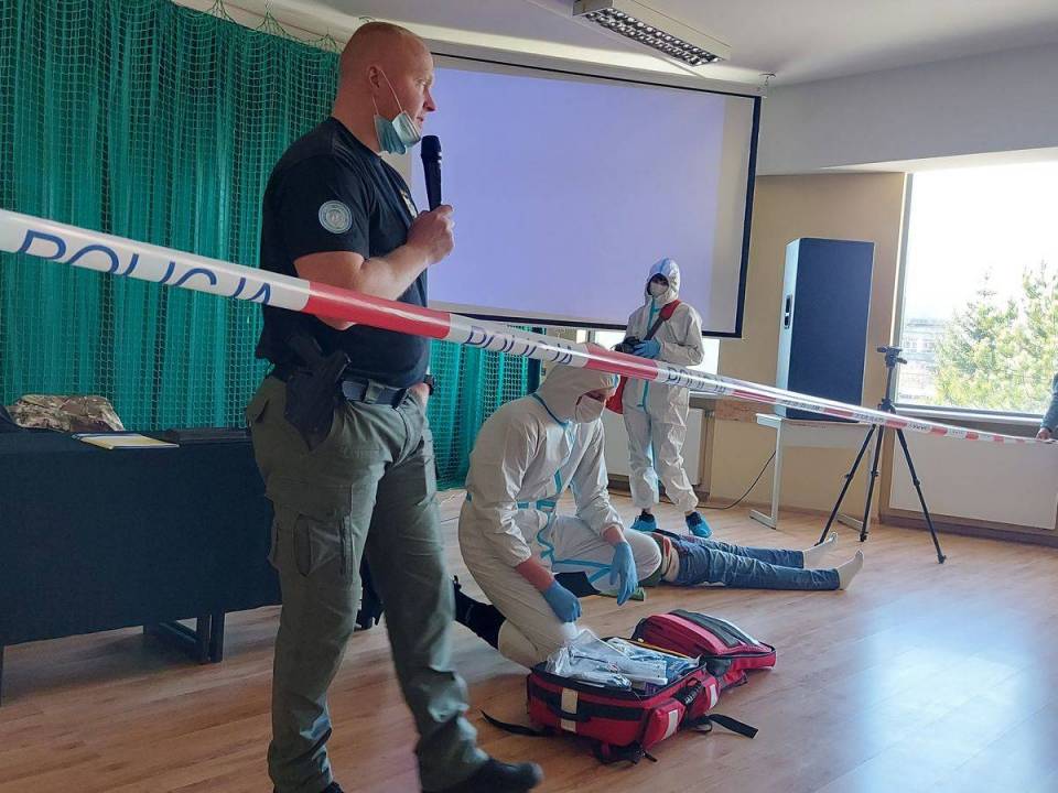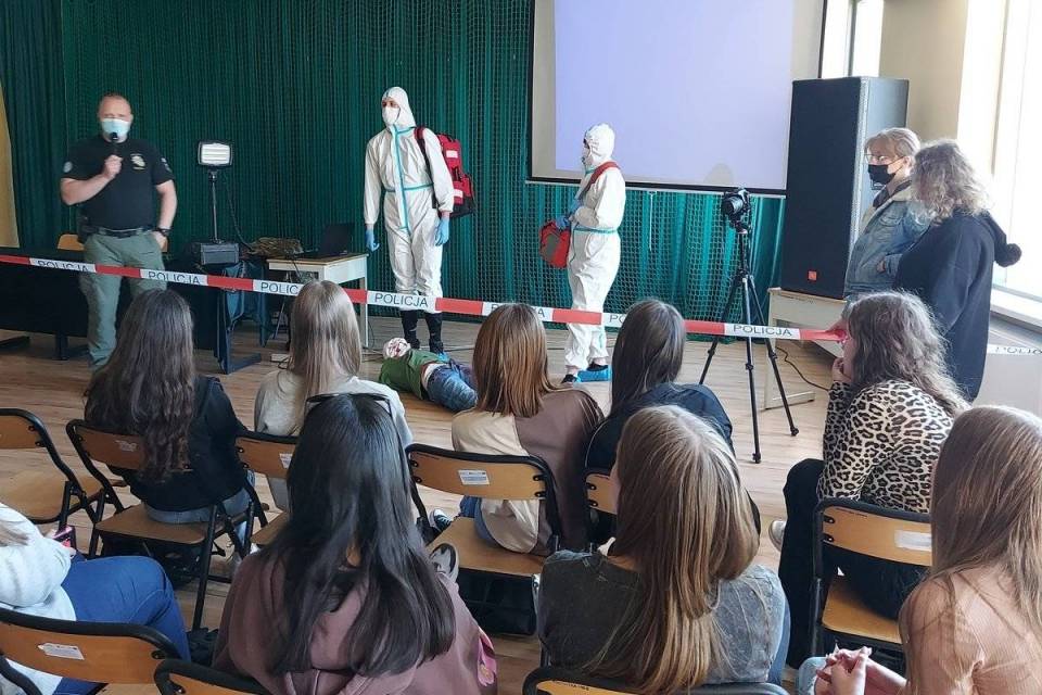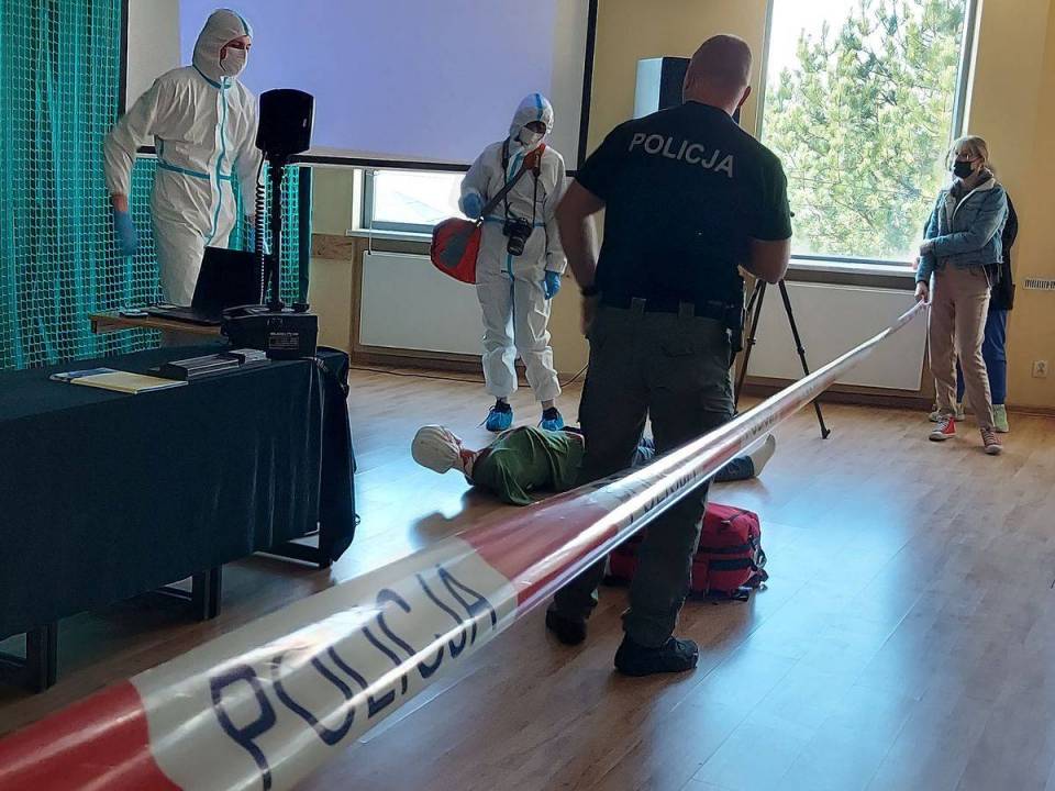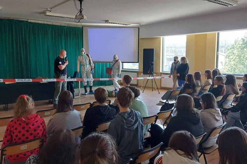 Policjant z Laboratorium Kryminalistycznego pokazał uczniom jak wygląda zabezpieczanie śladów linii papilarnych, czy biologicznych. Omówił z jakimi śladami można spotkać się na miejscu zdarzenia oraz na czym polega ich zabezpieczenie, utrwalenie, sfotografowanie i udokumentowanie. Omawiając oględziny przygotowanego miejsca podkreślał, że często zwłoki zostają znalezione dopiero w czasie rozkładu, kiedy np. inne osoby wyczują niepokojący, nieprzyjemny zapach. Taki policjant musi mierzyć się z widokiem i zapachem, z którym często inni by sobie nie poradzili. Podkreślał, że technik nigdy nie może się cofnąć na miejscu zdarzenia, musi wykonać swoją pracę od początku do końca. Jest odpowiedzialny za znalezienie, zabezpieczenie i utrwalenie śladów oraz wykonanie dokumentacji fotograficznej, czasem też materiału video.