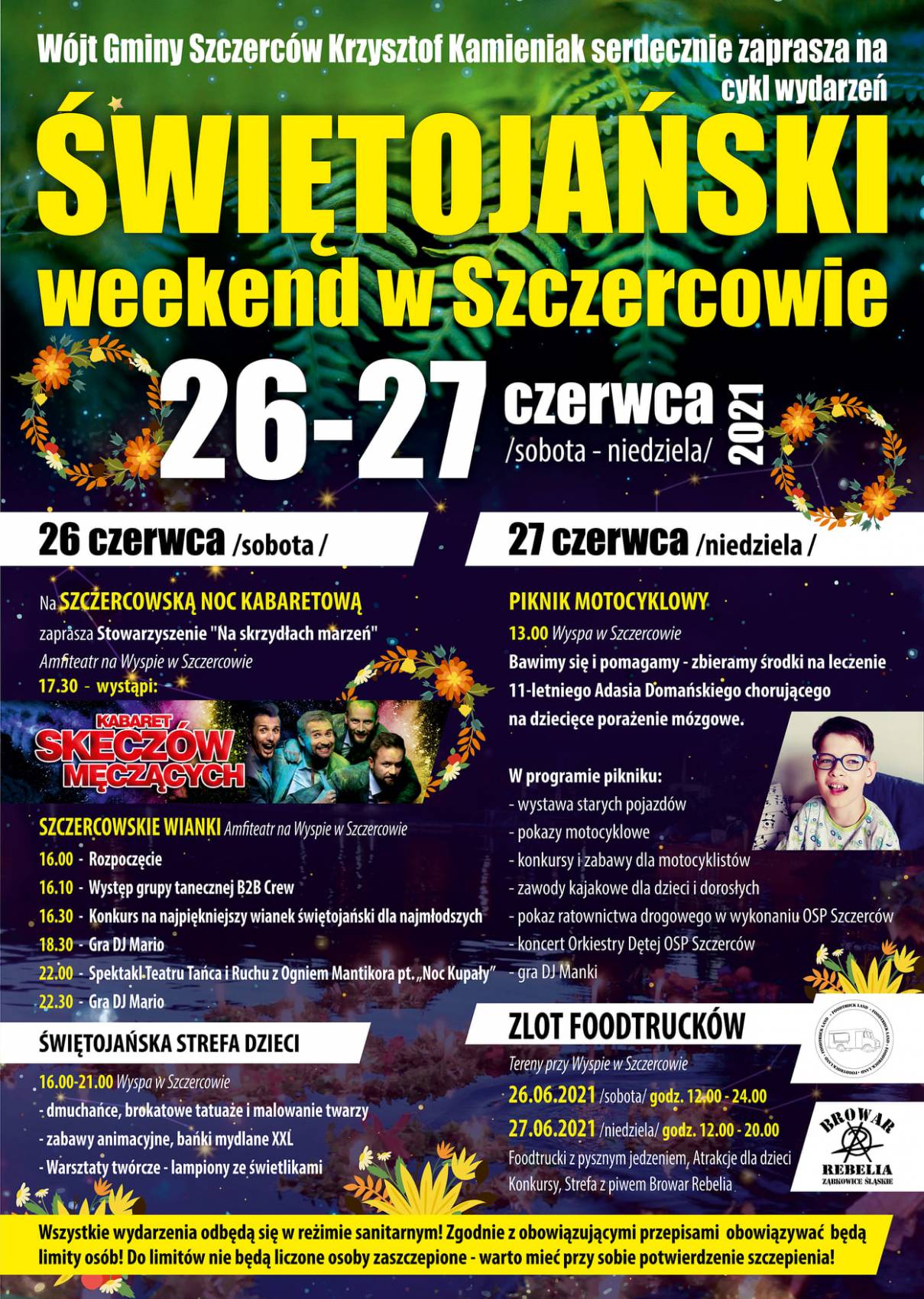 Świętojańska Strefa Dzieci rozpocznie działanie już o 16.00, występem grupy tanecznej B2B Crew, zaraz później ekscytować się będziemy konkursem na najpiękniejszy wianek, zagra DJ Mario a o 22.00 obejrzymy pokaz Teatru Tańca i Ruchu z Ogniem. Sobotni wieczór zakończy dyskoteka. W niedzielę połączymy przyjemne z pożytecznym – od 13.00 zapraszamy na piknik motocyklowy, a na nim między innymi wystawa starych pojazdów, pokazy motocyklowe, pokaz ratownictwa drogowego w wykonaniu druhów z OSP Szczerców, zagra też orkiestra dęta z tej jednostki. Podczas pikniku zbierane będą środki na leczenie 11-letniego Adama Domańskiego, który choruje na dziecięce porażenie mózgowe.