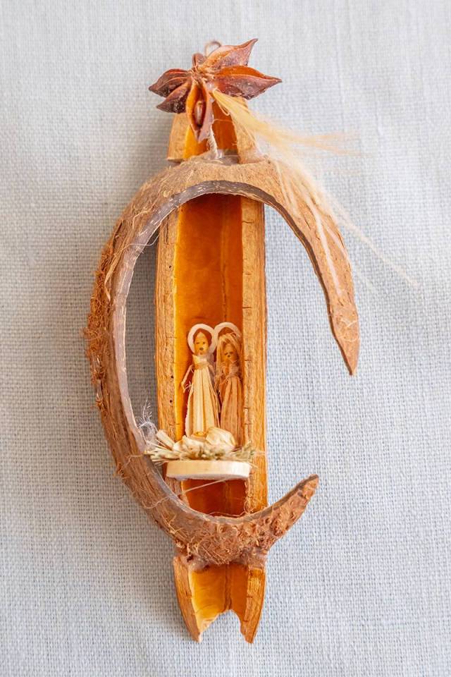 Bazą do wykonania tych niezwykłych, mikroskopijnych ozdób są tylko naturalne materiały: łupiny orzechów, żołędzie, główki makówek, kawałki drewna, traw, kora, mech, ziarnka zbóż. Jak mówi sam artysta, wykorzystuje to, co innym może wydawać się bezwartościowe. Jego pracownia to prawdziwy magazyn m.in. łupinek po orzechach włoskich, które ma w swoim ogrodzie, ale i które przynoszą mu ludzie. Pan Mariusz potrafi z nich wyczarować praktycznie wszystko – orzech może być dzikiem, pszczółką Mają, konikiem na biegunach, brzuchem Mikołaja, kulami bałwanka czy wózkiem dla malutkiej małpki. Każda ozdoba zachwyca precyzją wykonania i niewiarygodną fantazją autora. Figurki grają na instrumentach, wspinają się po linach, jeżdżą na wózeczkach.