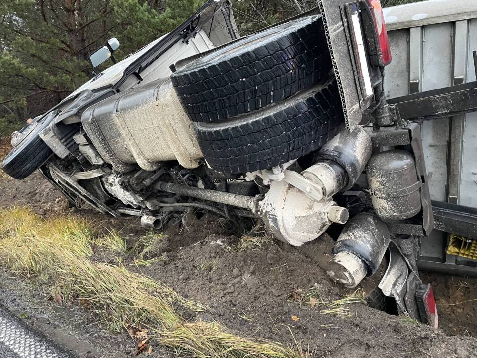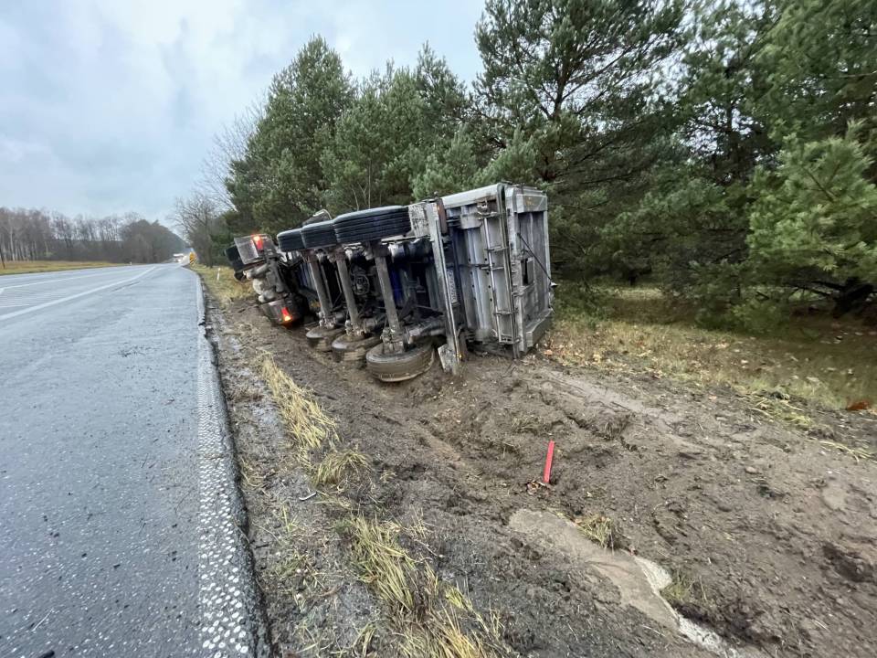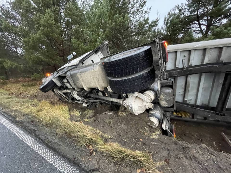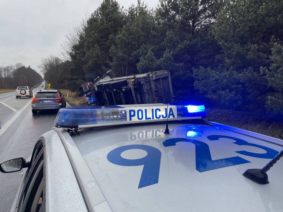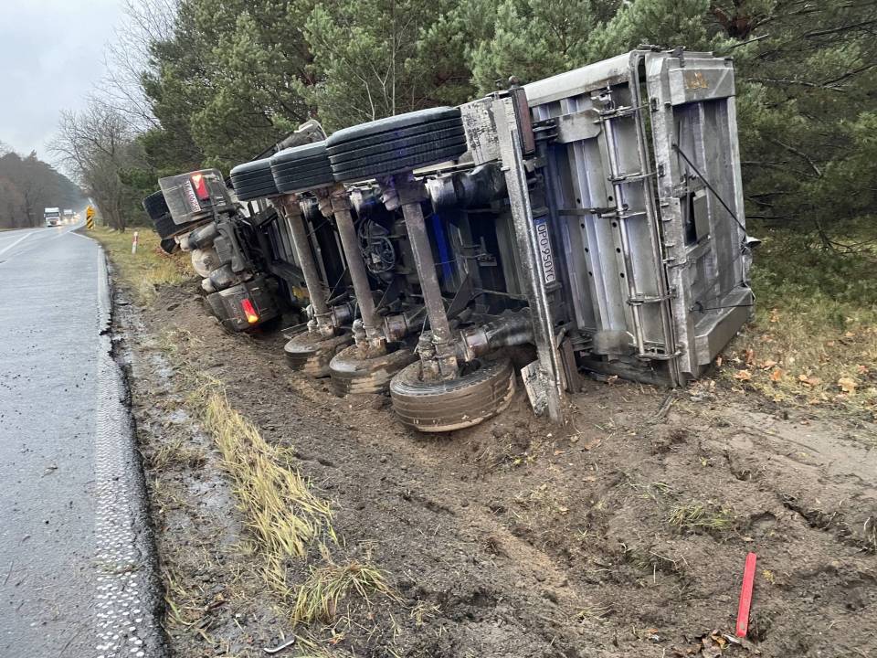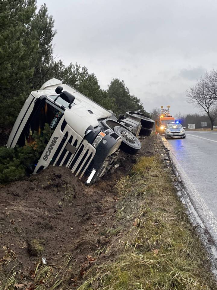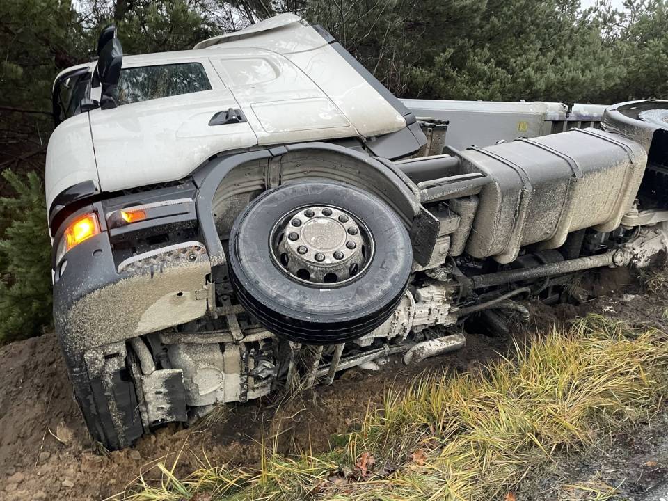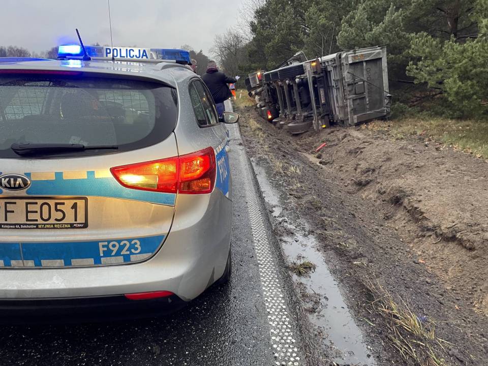 Ciężarówka z ładunkiem wpadła do rowu, po tym - jak udało nam się nieoficjalnie ustalić - jej kierowca chciał uniknąć zderzenia ze zwierzęciem, które nieoczekiwanie wbiegło na drogę. Wszystko wskazuje na to, że kierowca stracił panowanie nad prowadzonym pojazdem i podróż zakończył w przydrożnym rowie. Ciągnik siodłowy z naczepą przewrócił się na bok.