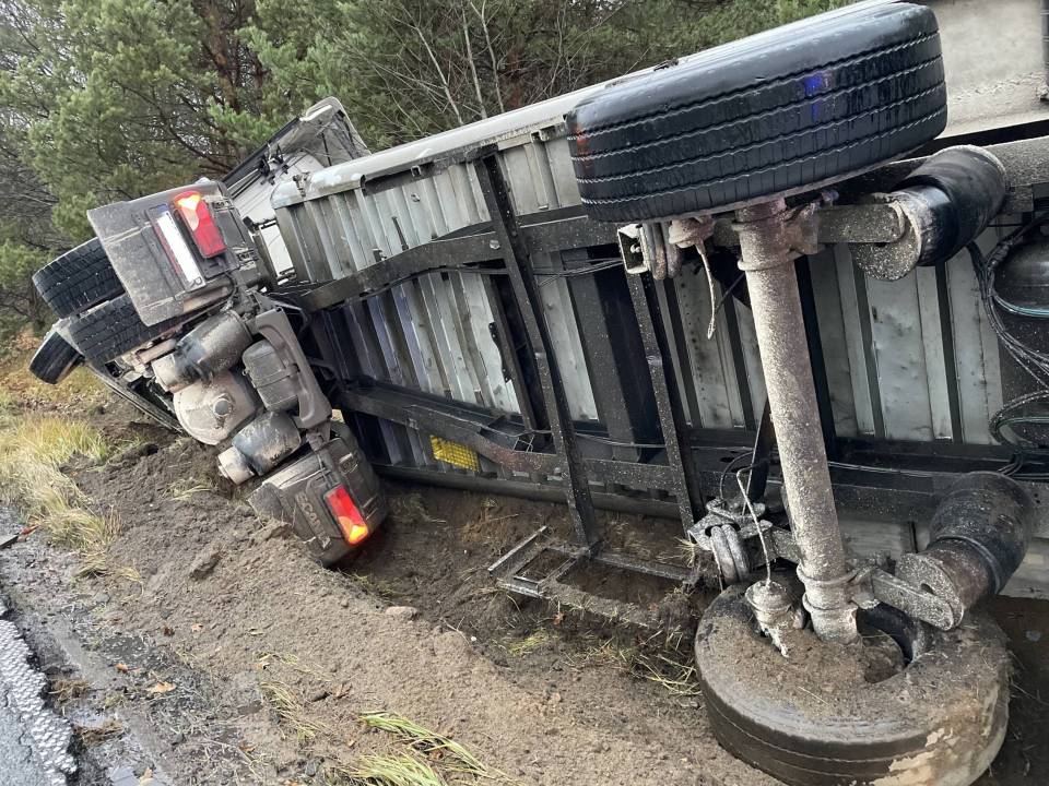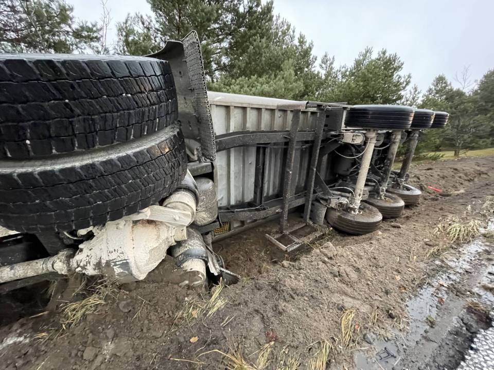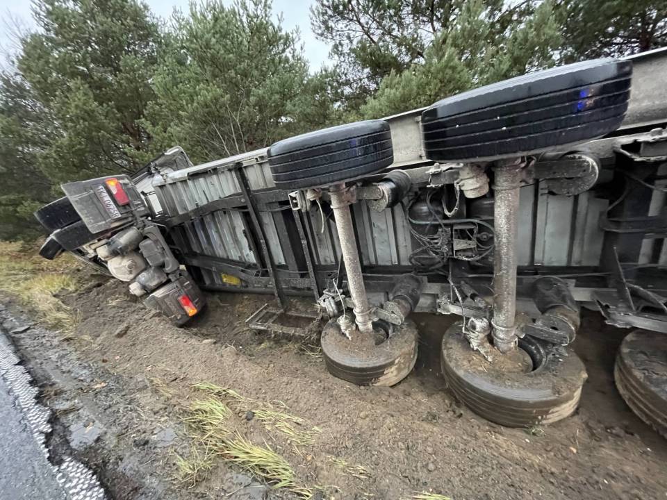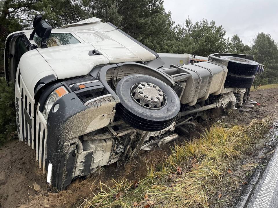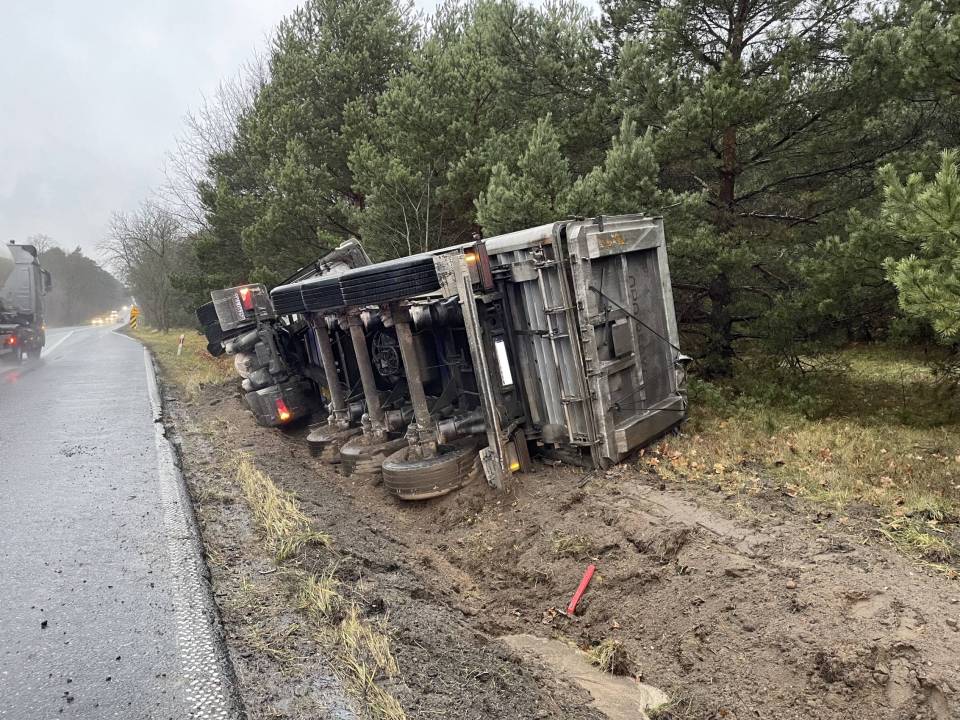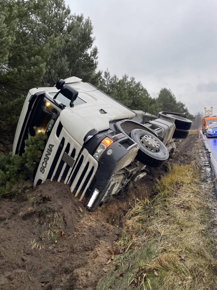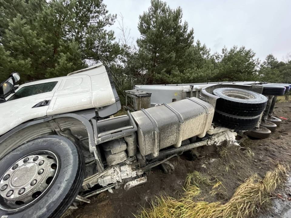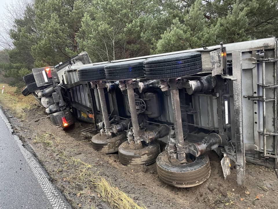 Ciężarówka z ładunkiem wpadła do rowu, po tym - jak udało nam się nieoficjalnie ustalić - jej kierowca chciał uniknąć zderzenia ze zwierzęciem, które nieoczekiwanie wbiegło na drogę. Wszystko wskazuje na to, że kierowca stracił panowanie nad prowadzonym pojazdem i podróż zakończył w przydrożnym rowie. Ciągnik siodłowy z naczepą przewrócił się na bok.