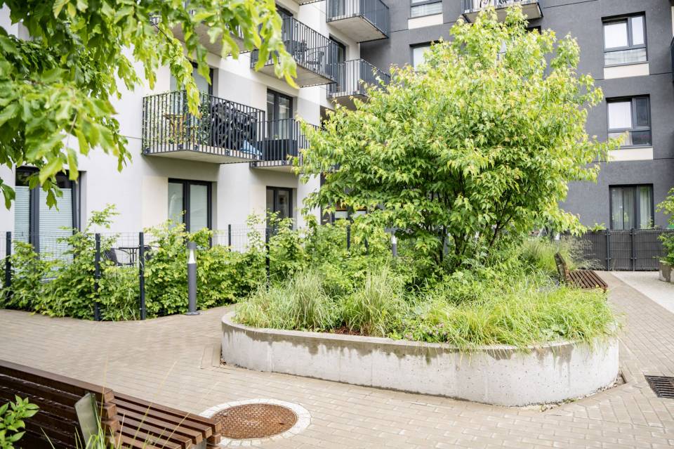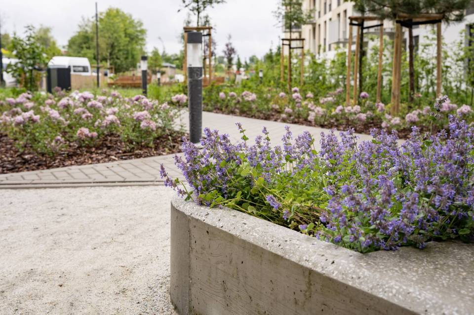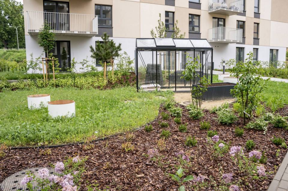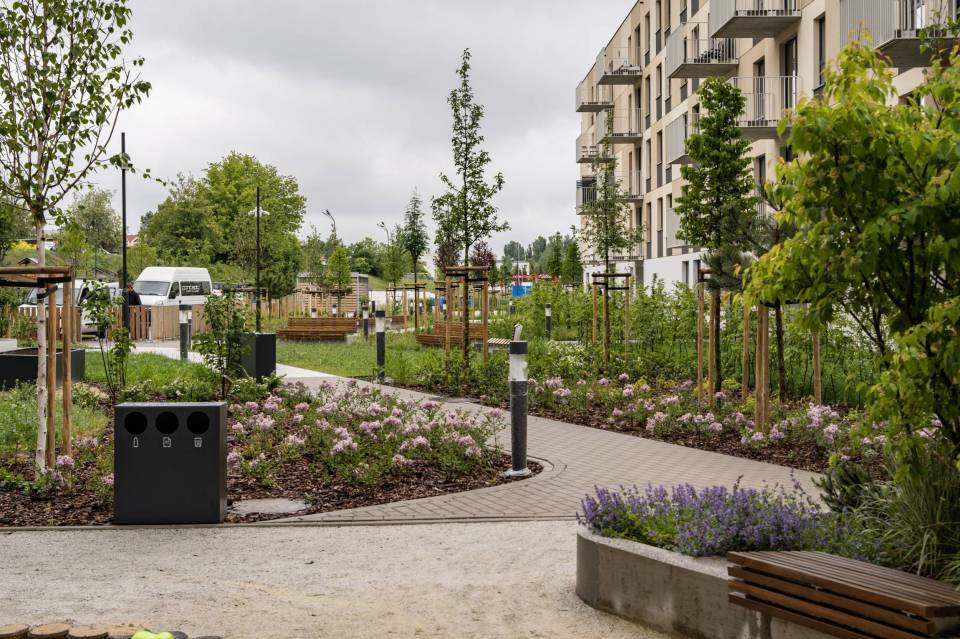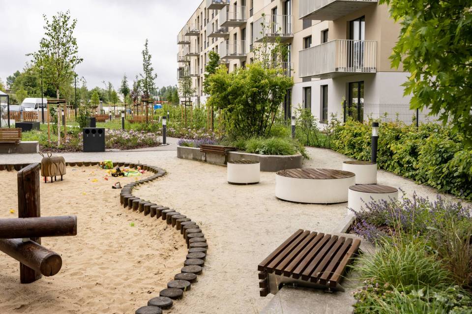 Firma jest wykonawcą prac m.in. na nowym osiedlu powstającym na łódzkim Widzewie, przy ul. Wałowej. Między blokami, gdzie większość mieszkań jest jeszcze pustych już zielenią się trawniki, rosną drzewa, są gotowe łąki kwietne. Droga pożarowa jest wykonana z siatki, między którą również rośnie trawa. Choć wokół jeszcze trwają prace ziemne, ogródek już jest gotowy. Na najmłodszych czeka plac zabaw.