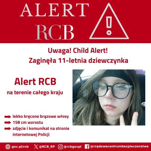 Polska policja uruchomiła procedurę Child alert w związku z poszukiwaniami zaginionej 11-letniej Patrycji Głowani, mieszkanki Dziewkowic na Opolszczyźnie. Dziewczynka zaginęła we wtorek, 13 maja, kiedy to po wizycie u dziadków nie wróciła do rodzinnego domu. Od tamtej chwili nie nawiązała kontaktu z rodziną. W środę Rządowe Centrum Bezpieczeństwa (RCB) wysłało pilny, sms-owy komunikat alarmowy do mieszkańców całej Polski.