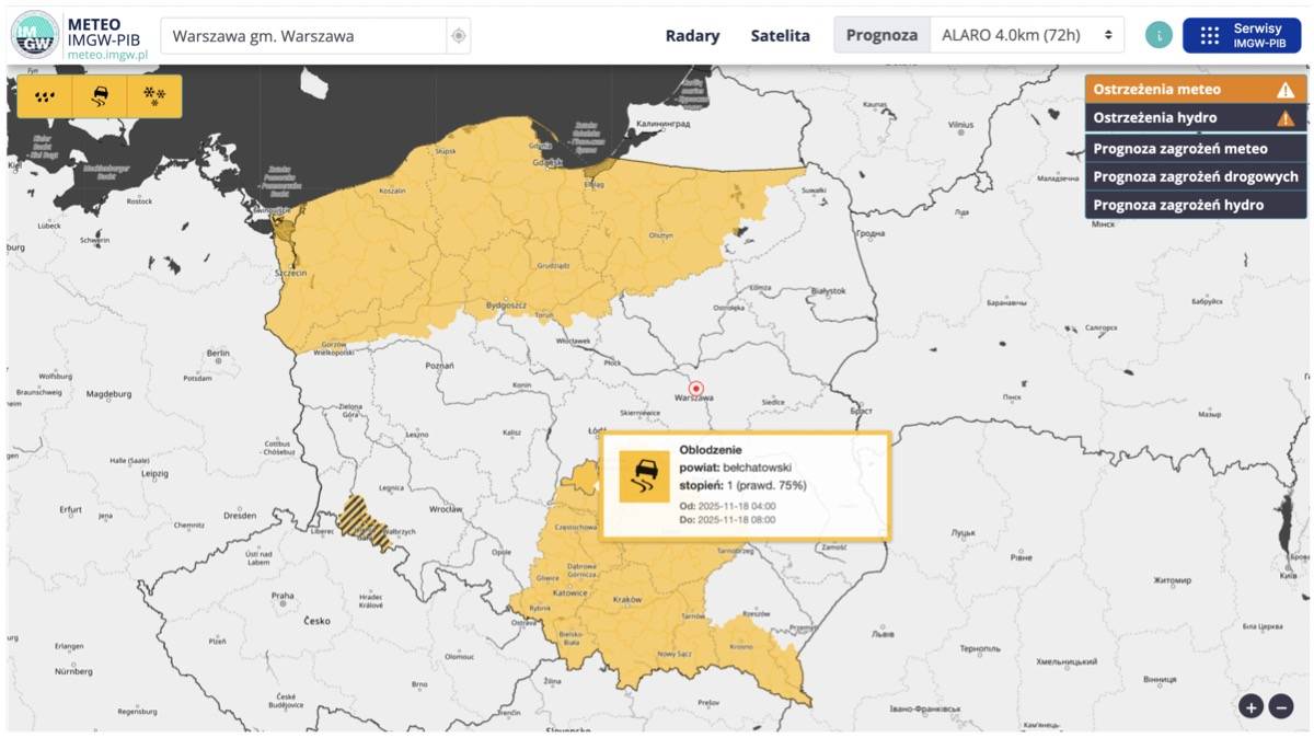 IMGW podkreśla, że zjawisko może pojawić się miejscami i bardzo szybko, dlatego warto zaplanować poranne wyjścia z domu z większym wyprzedzeniem oraz zachować ostrożność na mniej uczęszczanych drogach i lokalnych trasach.