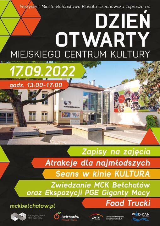 Na tym nie koniec. W sobotę, 17 września szykuje się jeszcze wiele atrakcji. Od godz. 13:00 do 17:00 w swoje progi na Dzień Otwarty zaprasza Miejskie Centrum Kultury. Będzie okazja, aby dowiedzieć się co placówka przygotowała na nowy sezon, obejrzeć pracownie, poznać instruktorów, a także zapisać się na zajęcia. Przygotowaliśmy także sporo darmowych atrakcji, m.in. zwiedzanie ekspozycji MCK PGE Giganty Mocy, seans w Kinie Kultura, kreatywne warsztaty. Będzie też wernisaż wystawy, zaś Ci, którzy zgłodnieją będą mogli skorzystać z food trucków, które zaparkują na placu za Gigantami Mocy. To wszystko już w sobotę, 17 września w godz. 13:00-17:00.