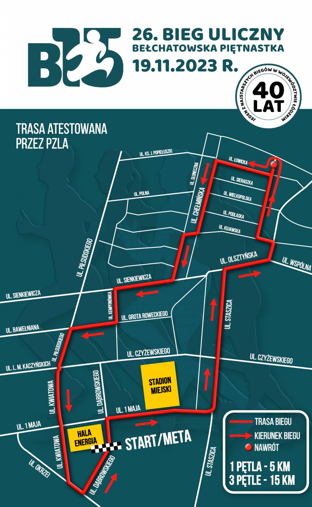 Mija 40 lat od pierwszej odsłony „Bełchatowskiej Piętnastki", a 26. edycja tego wyjątkowego Biegu Ulicznego przed nami. Już w najbliższą niedzielę, 19 listopada odbędzie się to największe wydarzenie w kalendarzu miejskich imprez sportowych. Do naszego miasta zawita około 700 biegaczy z całej Polski, a także spoza granic kraju. Organizacja biegu spowoduje utrudnienia w ruchu drogowym, które wystąpią w godzinach 11:30 – 14:00. Z uwagi na czasowy i krótkotrwały charakter biegu nie jest planowane wyznaczanie objazdów.