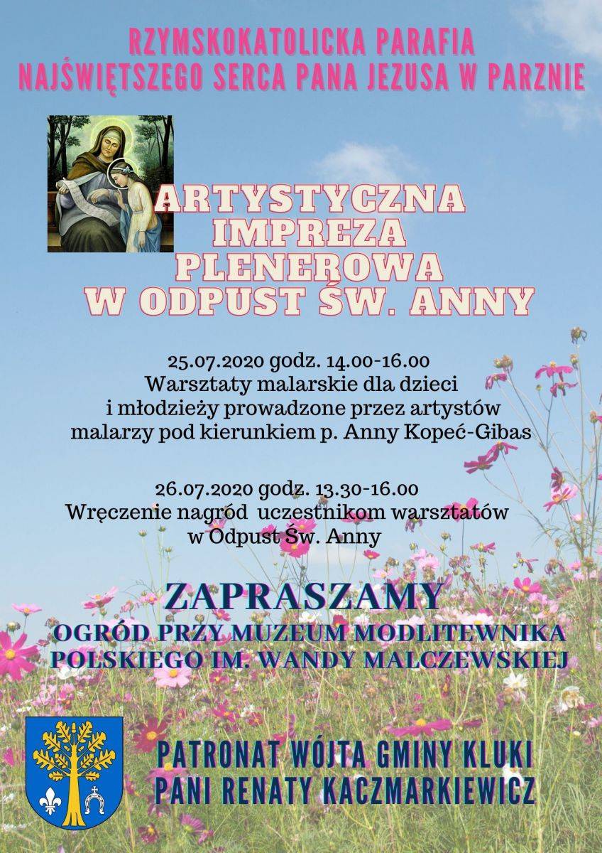 Rzymskokatolicka Parafia Najświętszego Serca Pana Jezusa w Parznie zaprasza na Artystyczną Imprezę Plenerową w Odpust Św. Anny.